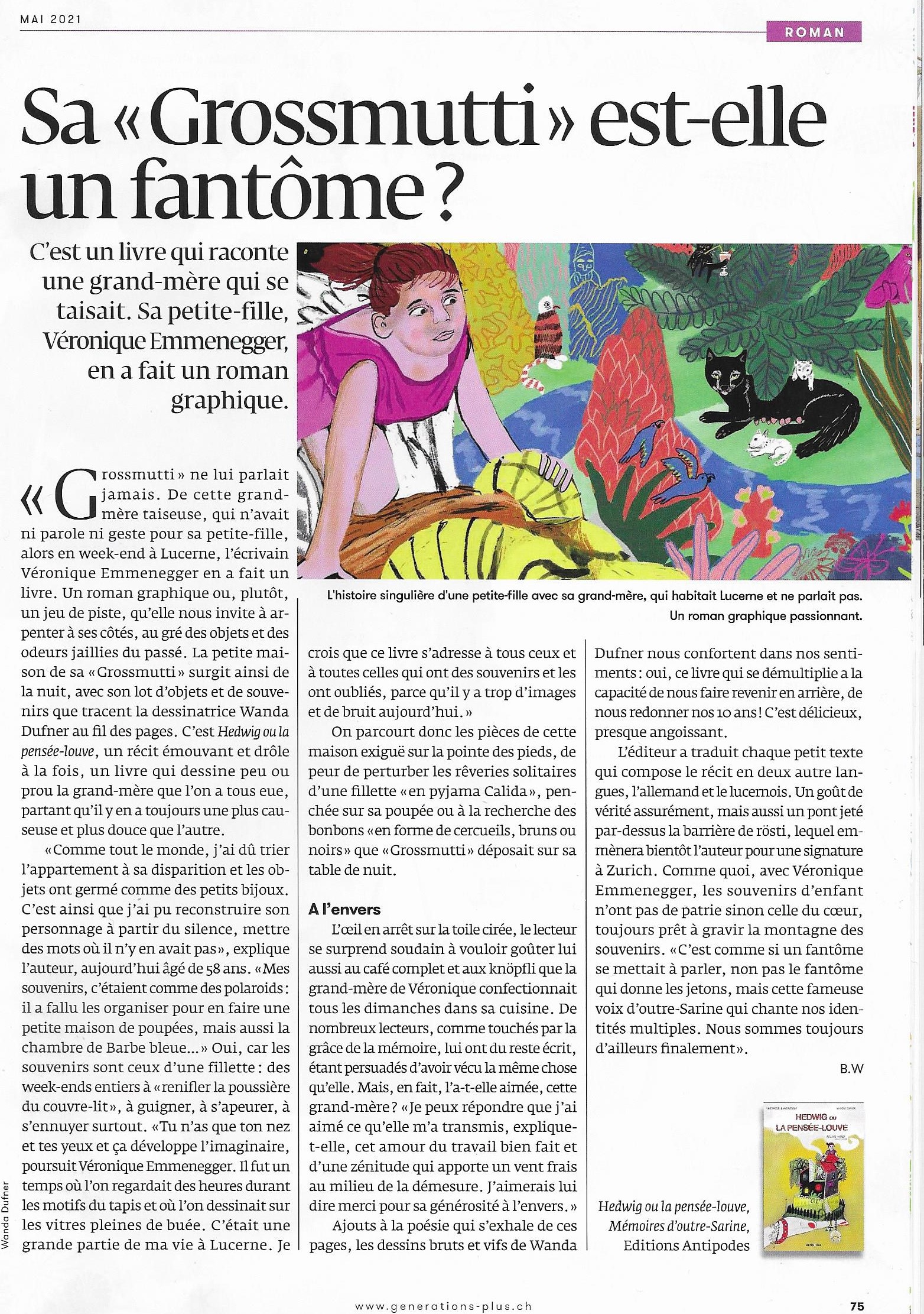 «Hedwig ou la Pensée-louve» est ma relation de petite fille avec ma grand-mère Hedwig passée par le prisme de la non-communication verbale. Même si nous ne parlions pas la même langue, les nombreux séjours à Lucerne ont laissé un souvenir impressionnant dans ma tête d’enfant.