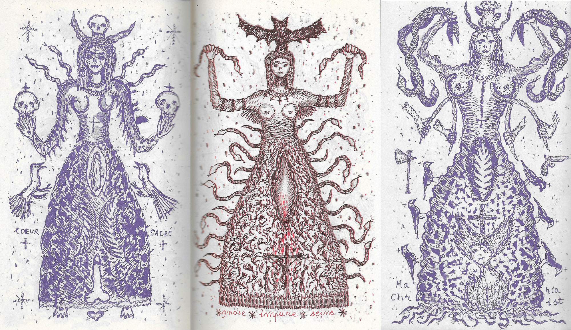 Bras écartés, seins nus, les vierges saintes tiennent des serpents dans chaque main en nous regardant droit dans les yeux. Enfantines, étranges, vainqueures, elles nous fixent. Protégées par des yeux, elles ne craignent pas de tenir les couteaux par le manche, de croiser les ossements, d’invoquer le soleil et les chiens,