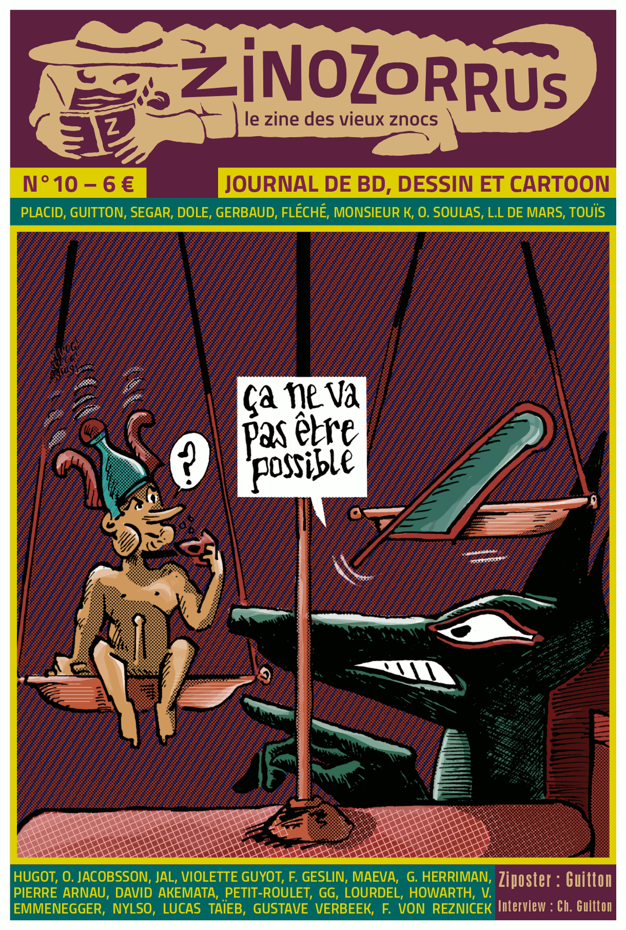 «En enlevant à un démon son sexe, obtient-on un ange?» (dans Huguette et Francine). Hommage à Pierre Guitton disparu en juillet 2021, ce Zinozorrus no 10 foisonne de jubilations visuelles. On y retrouve les «Variations Buster» de LL de Mars, la fragilité assumée de Nylso «Un July tout seul dans la Forêt-noire», les extraits de livres collectés par-dessus l’épaule de Françoise Geslin et Gg, les aventures clébardiennes de Têt’chien de Touïs, ainsi que le Ziposter maxicoquin de Pierre Guitton.